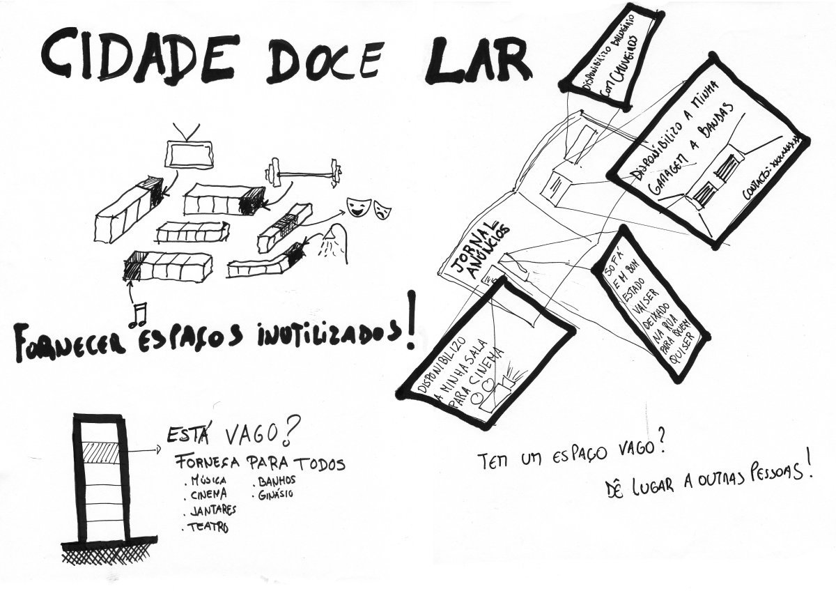 Poster designed on the basis of all the drawings collected from the Museu da Crise workshops in which in total 87 people participated. This poster was spread all over the city of Guimarães, so the participants could all see the result and comment what their work and input led to.