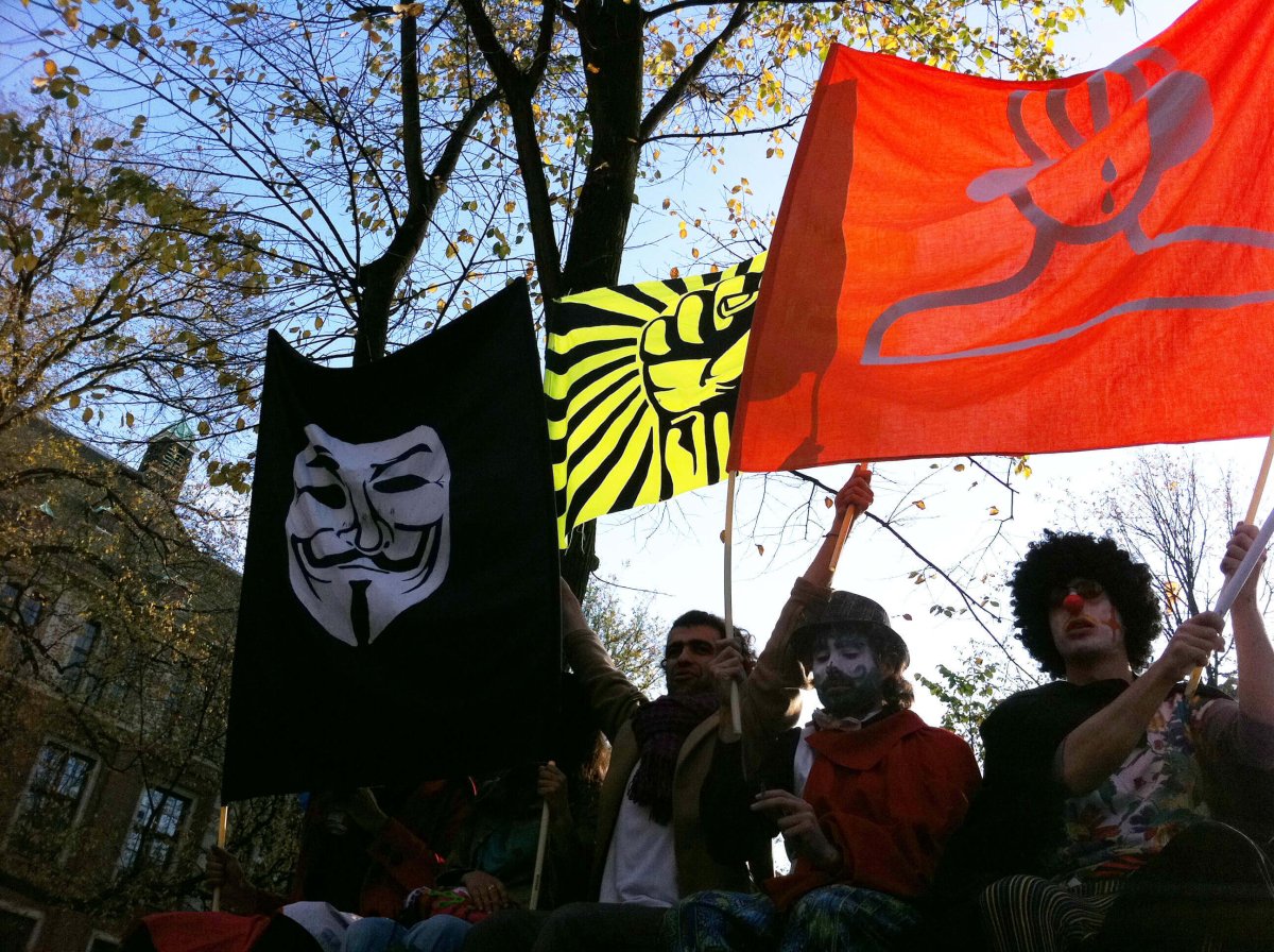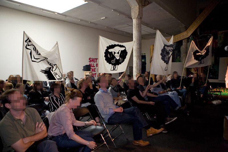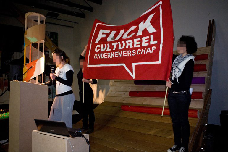 The cultural sector was also hit unprecedentedly and disproportionately hard by budget cuts. The KUT! Banner, that SPANONYMOUS made especially for the manifestation against these cuts on June 27, 2011 at the Malieveld in The Hague, has been frequently in the news. Also during Occupy Amsterdam 2011 the SPANONYMOUS banners where visible in different media reportages of the event.