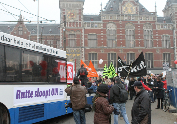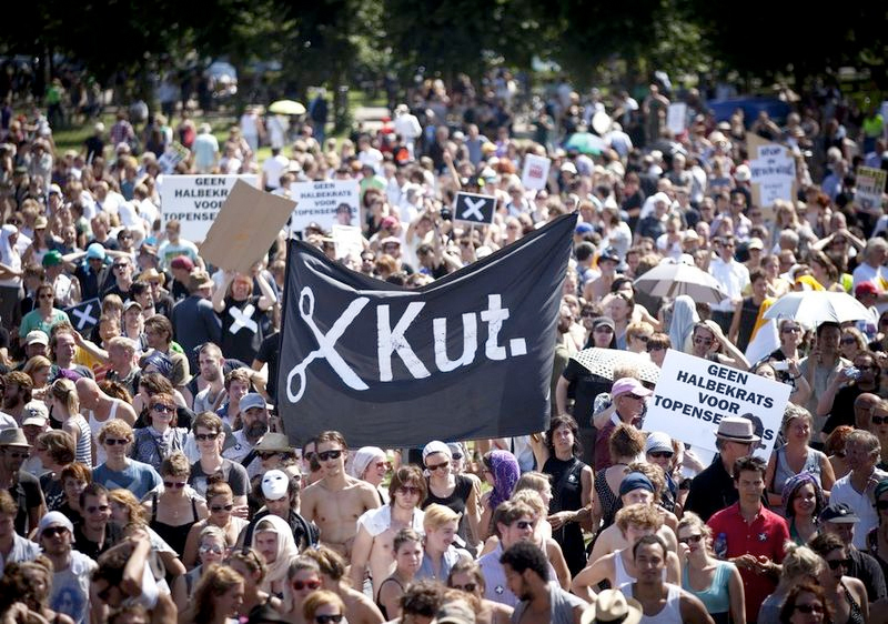 SPANONYMOUS launched a media campaign with the ultimate goal of the fall of Rutte I. Together the collective designed and created the SPANDOEKOTHEEK: a growing collection of more than 40 visually attractive handmade banners. The SPANDOEKOTHEEK could be borrowed by organizers of different demonstrations against the plans of the minority cabinet, to make their demonstrations visually strong. Because the media always chose the images of our banners to print in the newspaper or to display on television, supra-sectoral solidarity was radiated.