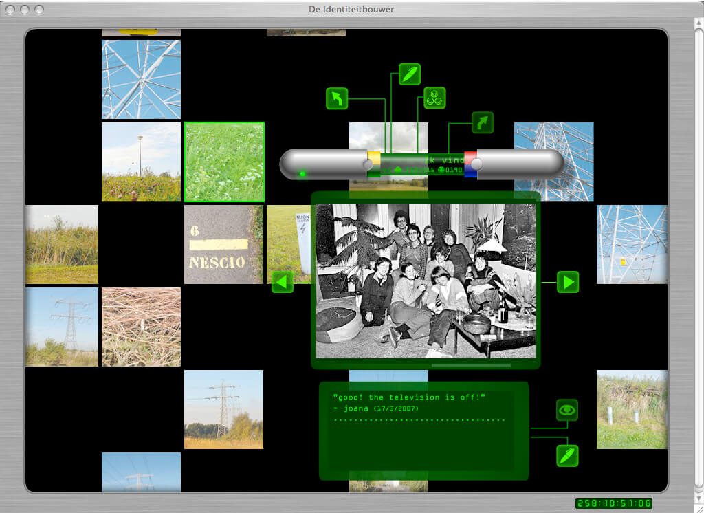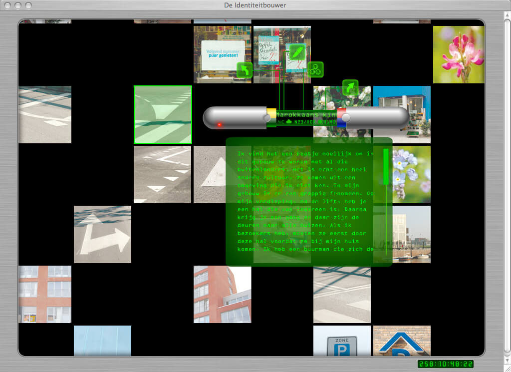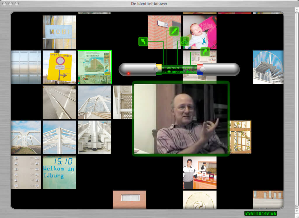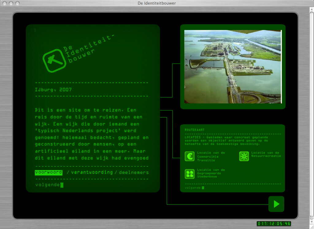 Paes Leãos project Identiteit Bouwer (Identity Builder) was addressing the lack of community history. She understood IJburg as a typically Dutch project: completely devised, planned to the centimetre, regulated from top to toe and constructed entirely by people on an artificial island in a lake. But how does one construct of build the identity of a neighbourhood without a (shared) history? And how does this compare to the opposite, the organic growth of a town where the unexpected, flexible social values, that which cannot be planned, is the evolutionary force in forging character and identity without premeditation? Paes Leão conducted extensive video interviews with local people from all walks of life, capturing both the optimism of the IJburg ‘pioneers’ as they moved into new homes and the divisions that soon emerged in the community through living together and negotiating relationships in this shared public space. The resultant film, using excerpts from famous films such as Blue Velvet (David Lynch) and Mon Oncle (Jacque Tati) as a mirror immage, was presented at The Blue House in the summer of 2006 with the source material subsequently incorporated into an artist website (www.identiteitbouwer.org) mapping the diverse ‘living history’ of inhabitants of Block 35. The site is a journey through questions about identity, urbanism and social development, critically analysing the concept of building a neighbourhood and consequently a completely new community in one go.